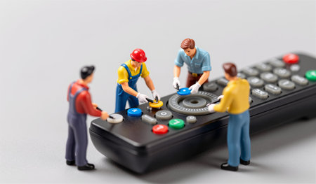 Four small figurines gather around a remote control, diligently fixing buttons and checking connections. Their teamwork sparks creativity on a simple, sleek gray background.