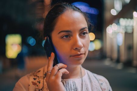 Young pretty girl using mobile phone or smartphone on night city street with blurred illuminated urban background, toned