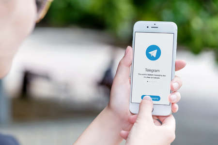 CHIANG MAI, THAILAND, NOV 17, 2019 : Woman hand holding iPhone X with Telegram