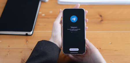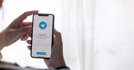 CHIANG MAI, THAILAND, JAN, 19, 2020: Woman hand holding iPhone X with social networking service Telegram on the screen. iPhone 10 was created and developed by the Apple inc.