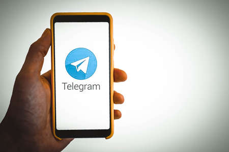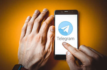 Telegram. Smartphone in a man's hand on the screen of a Telegram smartphone on a blue, yellow, black background. July 2020. Kiev, Ukraine.