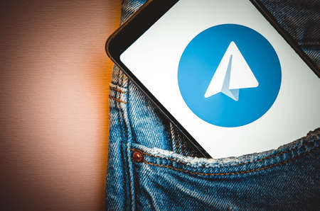 Telegram. Smartphone in the pocket of blue jeans on the Telegram smartphone screen on a blue, yellow, black background. Country in the smartphone Ukraine.