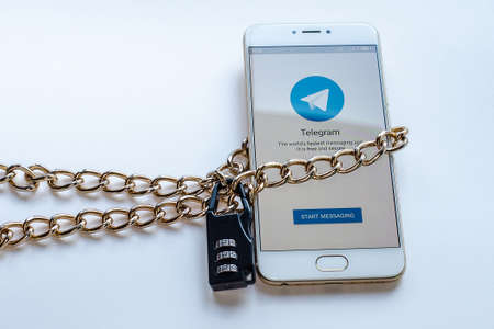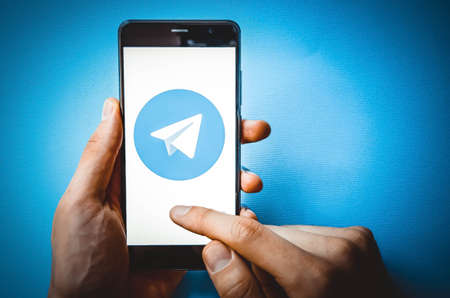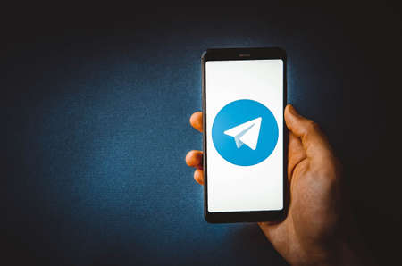 KYIV, UKRAINE-JUNE, 2020: Telegram. Studio Shot of Cellphone with Telegram Mobile Application on Blurred Back.