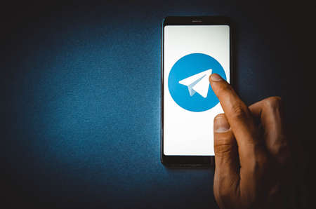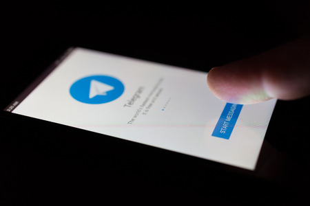 MOSCOW, RUSSIA - May 9, 2018: A smartphone lying on a desk in the dark, displaying the logo of the popular Telegram messenger. The finger above touch screen. Digital resistance. Communication freedom.