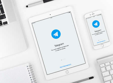 Moscow, Russia - March 12, 2016: Telegram application on iPad and iPhone display. Telegram is a cloud-based instant messaging service