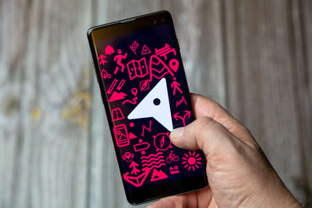 02-24-2021 Portsmouth, Hampshire, UK A mobile phone or cell phone on a wooden table with the OS maps app open next to a coffee and glasses