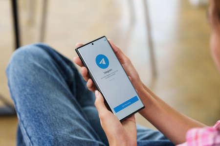 Vladimir, Russia - January 2022: Telegram application on a smartphone in the hands of a girl at night. Selective focus on the logo, narrow focus.
