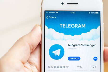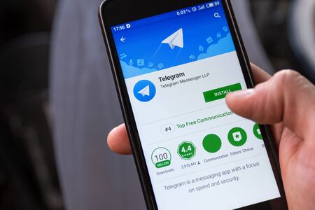 Kharkov, Ukraine - March 9, 2021: Man going to install popular social network Telegram app on the smartphone