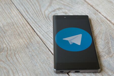 Telegram app logo on the screen smartphone closeup. Telegram is an online social media network.