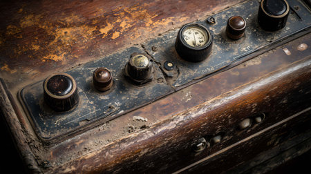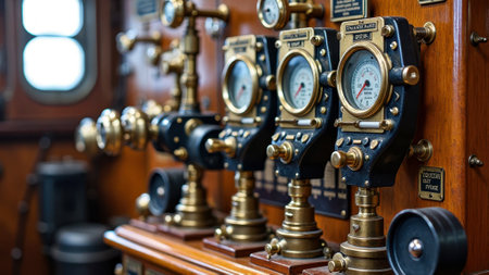 Vintage ship navigation equipment with dials and gauges on wooden panels. That the image is generated using AI.