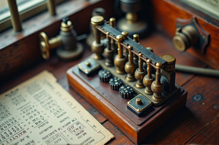 Vintage telegraph morse code machine on wooden desk among antique instruments.