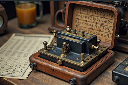 Antique telegraph machine with morse code chart and vintage electronics. That the image is generated using AI.