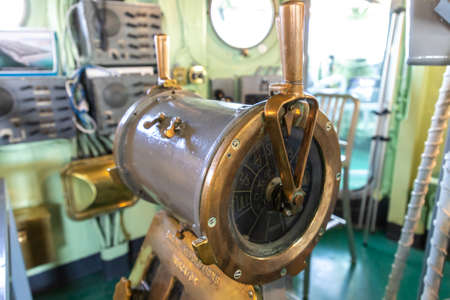 Vintage brass engine order telegraph in historic ship's wheelhouse interior. That the image is generated using AI.