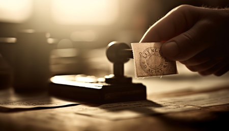 Closeup view of a beautifully embossed memorandum lying on the table illuminated by soft ambient lighting. A pair of hands adorned with an elegant watch gently presses a seal onto th