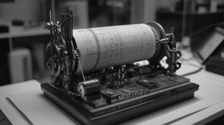 Explore the intricate design of a vintage mechanical device featuring a paper roll with printed graphs, set on an antique wooden table, ideal for historical themes.