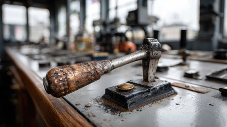 A close-up view of a vintage control lever on a ship's console, highlighting intricate details against a backdrop filled with nautical instruments and gauges.