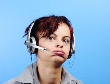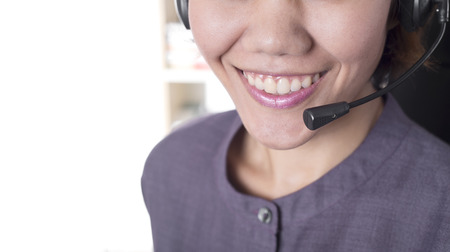 Happy smiling young caucasian woman with headset phone in a call center or office