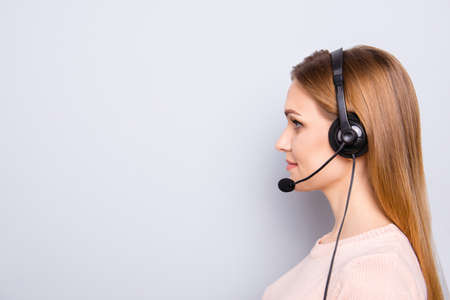 Telemarketing headset woman from call center woman in headphones speaking with client during her work at office