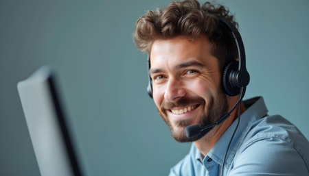 Friendly male call center agent wearing a headset, ready to assist customers and solve issues.