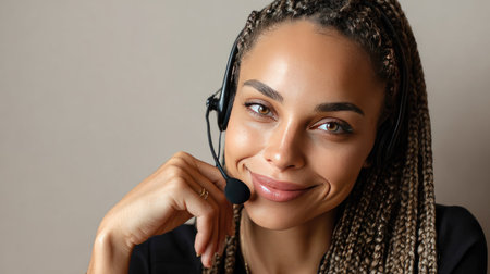 Close-up of African American charming confident young woman in headset, sitting in office, working as operator of call center or support service, looks directly at the camera and smiling friendly