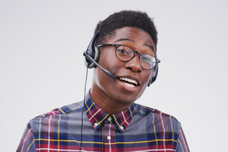 Exceptional communicative skills that exceed customer expectations. Studio portrait of a handsome young male customer service representative wearing a headset against a grey background.