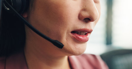 Woman, mouth or consultant with mic for telemarketing, customer service or online advice at call center. Japan, closeup or female person consulting with headset for virtual assistance or agent help