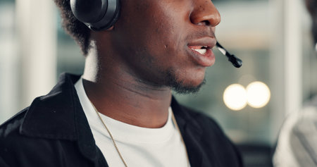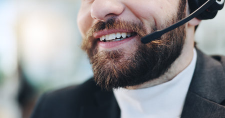 Mouth, mic and closeup with man at call center for contact us, telemarketing or telecom agency. Advice, FAQ and person with headset for communication, customer support help desk or virtual assistance