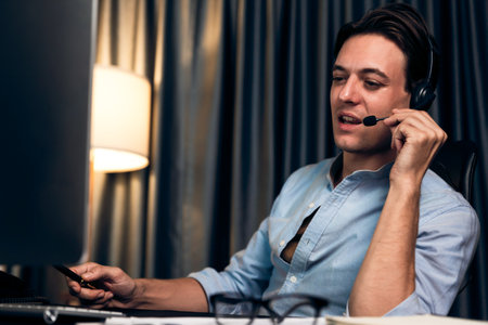 Call center consulting with customers on headphones on monitor in business paragraph with typing on pc with dynamic data marketing analysis planning at modern home office at night time. Pecuniary.