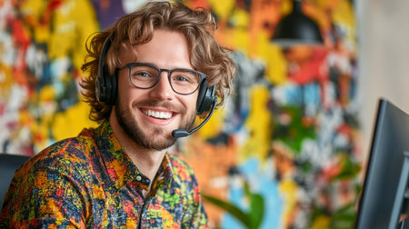 A cheerful man wearing a headset engages with clients in a vibrant office setting.