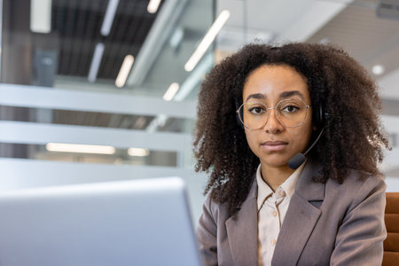Close-up portrait of a young African-American woman in a headset working on a laptop, sitting at a table and looking seriously into the camera.