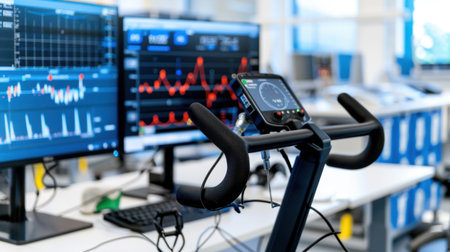 A sleek exercise bike positioned in a contemporary fitness lab, surrounded by high-tech screens displaying performance data and analytics charts.