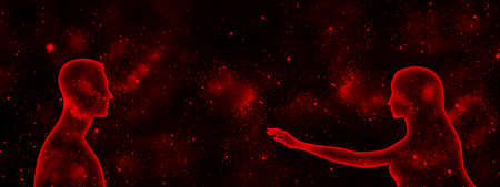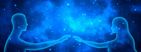 Male and female transparent silhouettes reach out to each other on a background of blue shining stellar universe