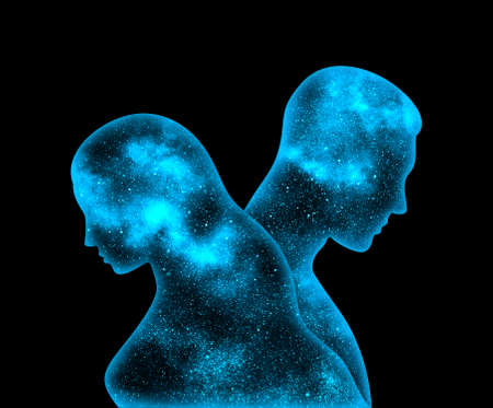 Double exposure of a female head and a male head in outer space.
