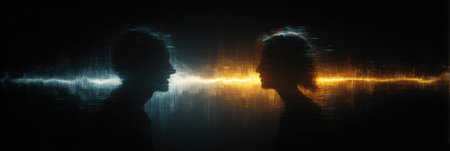 Two silhouettes face each other in darkness, with a vibrant audio waveform glowing between them, representing sound and emotional connection.