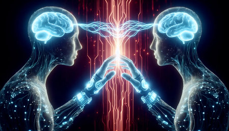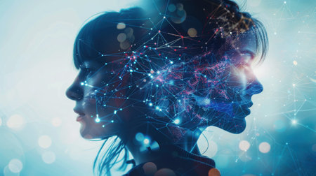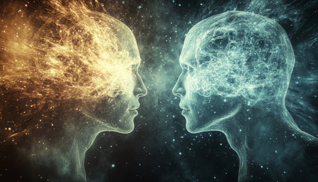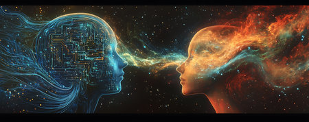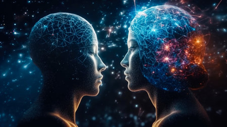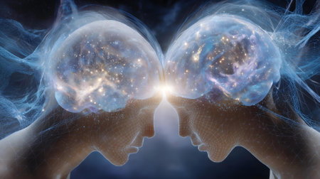 A captivating digital illustration depicting two human heads connected by streams of light and data against a cosmic background, symbolizing the fusion of technology and human consciousness.