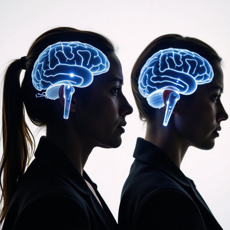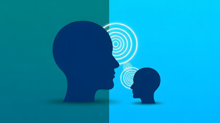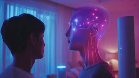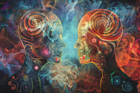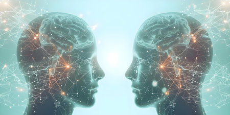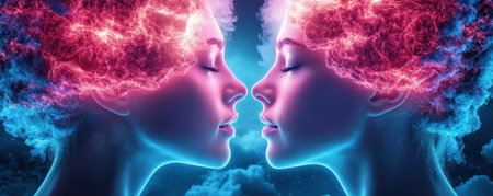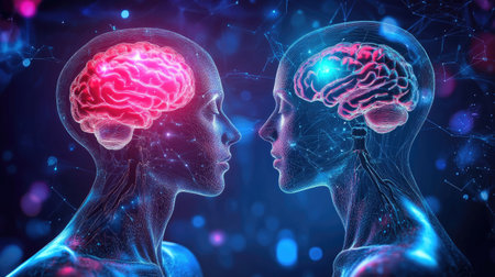 This digital artwork showcases two human heads in profile, highlighting brain activity with vibrant neural connections, symbolizing intelligence and cognitive processes.