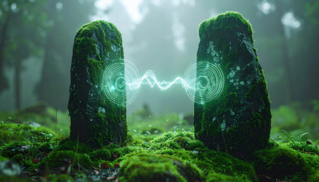 In the heart of a misty, ancient forest, two moss-covered monoliths hum with a mysterious power.