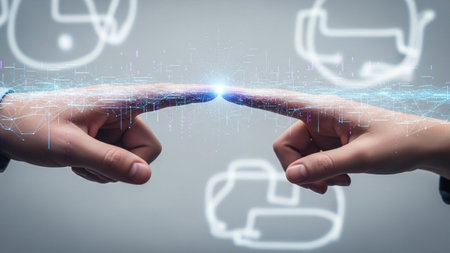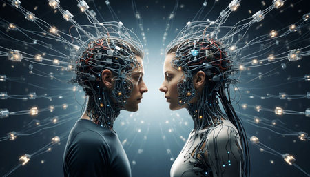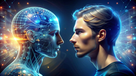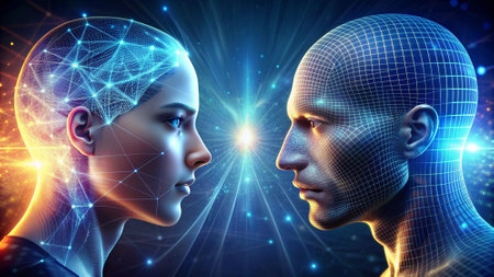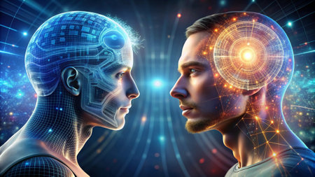 An artistic representation of the intersection between human and artificial intelligence, symbolizing the future.