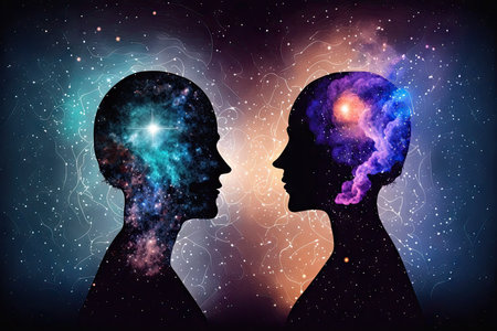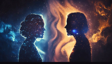 Digital art illustrates two figures facing each other, surrounded by glowing lights and cosmic patterns, symbolizing connection and love in a modern style.