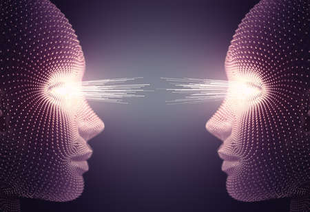 Two digital human heads made of binary code exchanging data through beams of light