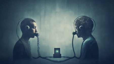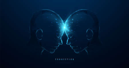 Two digital heads communicating through a glowing bridge of light