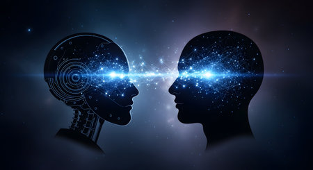 A futuristic concept image showing the silhouettes of a human head and a robot head facing each other against a cosmic background. Their minds are connected by glowing lines, representing a neural network, symbolizing artificial intelligence, machine learning, and human-computer interaction.