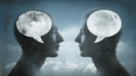 A vibrant interaction between two beings is captured as their words displayed within holographic speech bubbles shimmer and break apart into a cascade of light representing the seamles