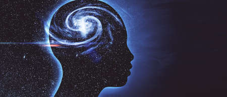Profile of a young man with mental activity brain and consciousness, with the cosmos as a brain. The scientific concept. The brain and creativity