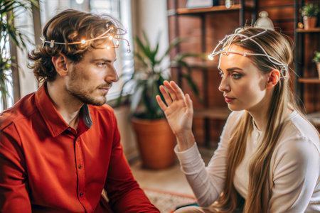 two people using brainwave technology to communicate with each other in a futuristic setting with monitors