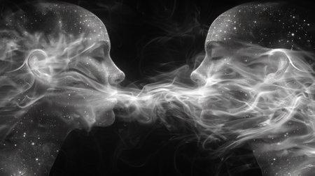 Two spiritual human bodies on dark background. Souls connection. Created with Generative AI