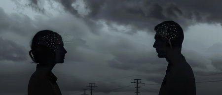 a man and woman face each other with their brains visualized and connected by a wave of energy light