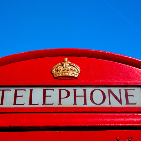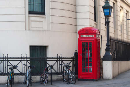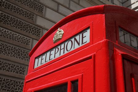 Old telephone in London, UK. Vintage telephone booth with red background.