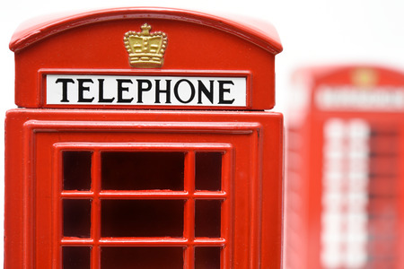 classic red telephone cabin foreground object and blurred neutral color gray day background space