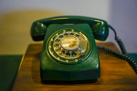A nostalgic vintage landline phone with a rotary dial rests on a marble table, evoking memories of simpler times and classic design elements in a retro setting.